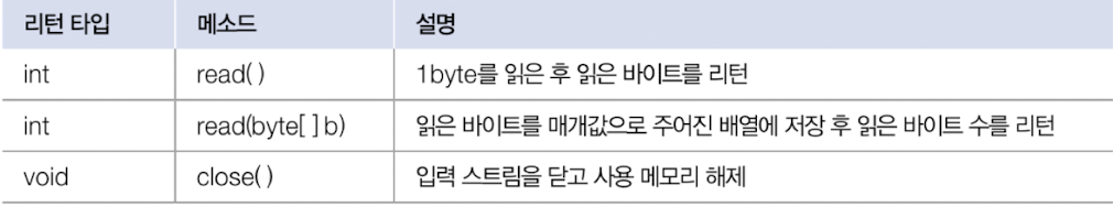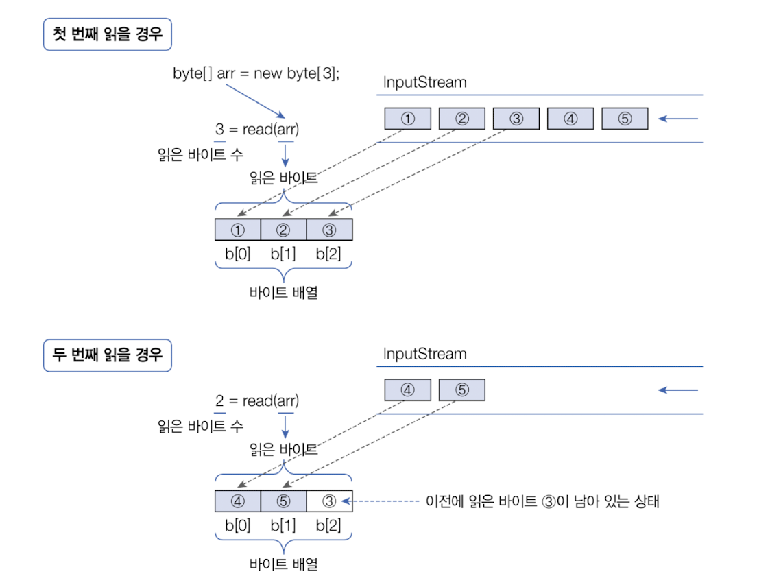 - read(byte[] b): inputStream으로부터 주어진 배열의 길이만큼 바이트를 읽고, 배열에 저장한 다음 바이트 수를 리턴