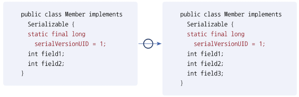 - 클래스 내용이 다르더라도 직렬화된 필드를 공통으로 포함하고, 두 클래스가 동일한 serialVersionUI 상수값을 가지고 있는 경우, 역직렬화 가능
