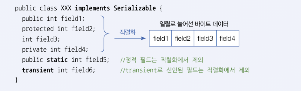- 객체가 직렬화될 때, 인스턴스 필드값은 직렬화 대상이지만, static 필드값과 transient로 선언된 필드값은 직렬화에서 제외