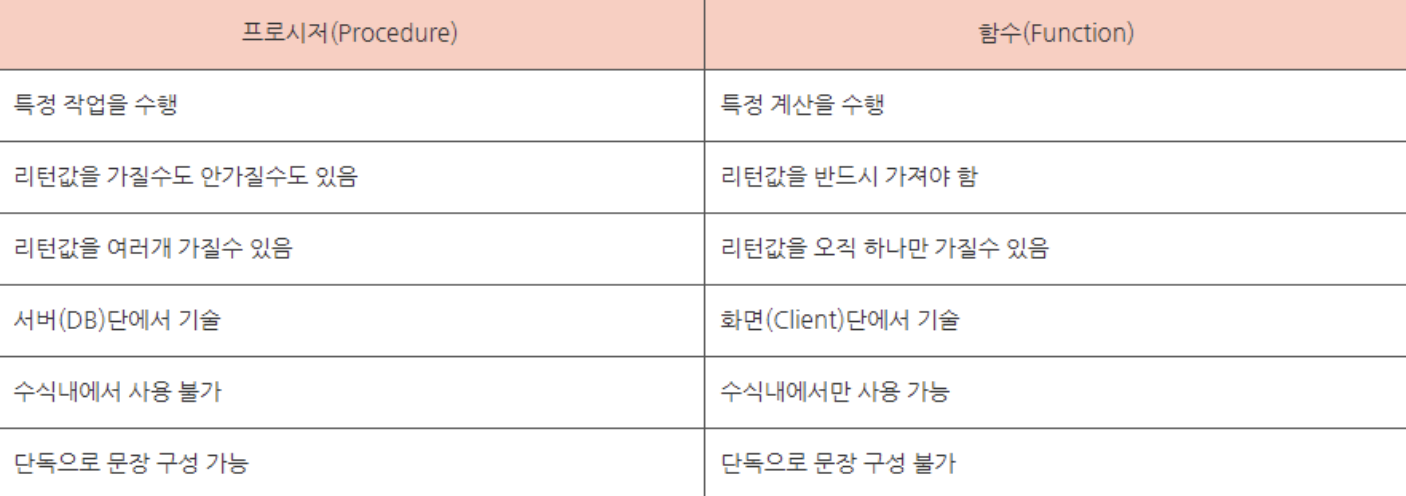 함수와 프로시저의 차이 - procedure: 어떤 프로세스를 절차적으로 기술해놓은 것 ex) 쇼핑몰 회원 로그인 -> 구매할 신발 선택 -> 개인정보 및 배송지 선택 -> 결제 - function: 각 프로세스를 수행하기 위해 필요한 기능 ex) 쇼핑몰의 로그인 기능 중 ID와 PW를 체크하는 기능
