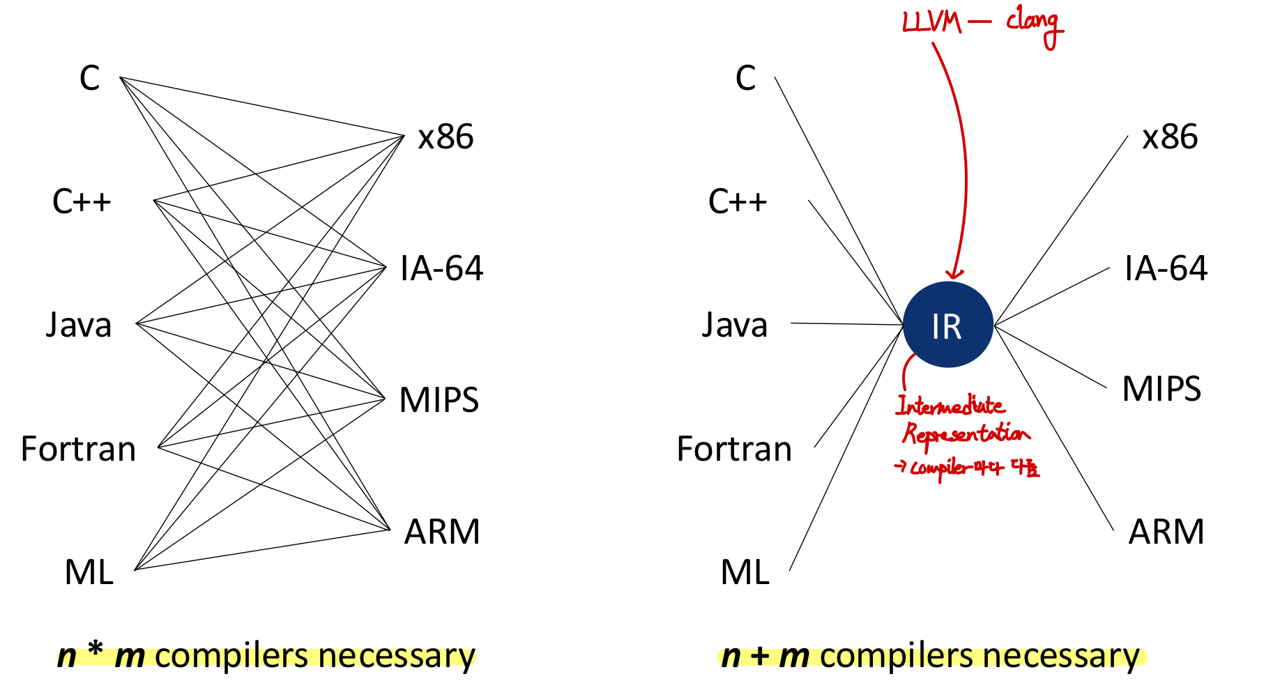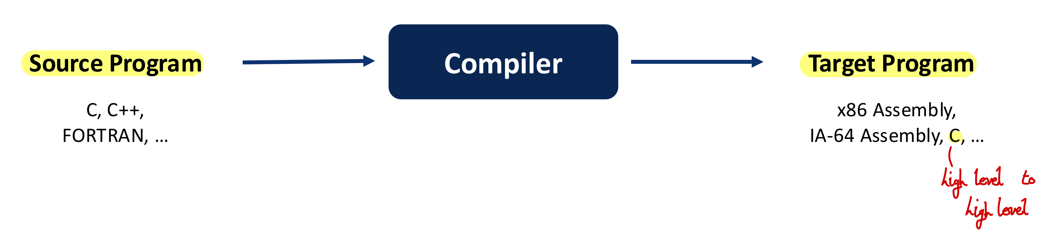 - compiler: source language로 작성된 프로그램을 기능적으로 동등한 target language로 작성된 프로그램으로 번역하는 프로그램