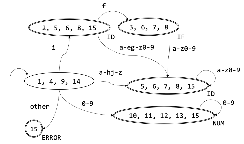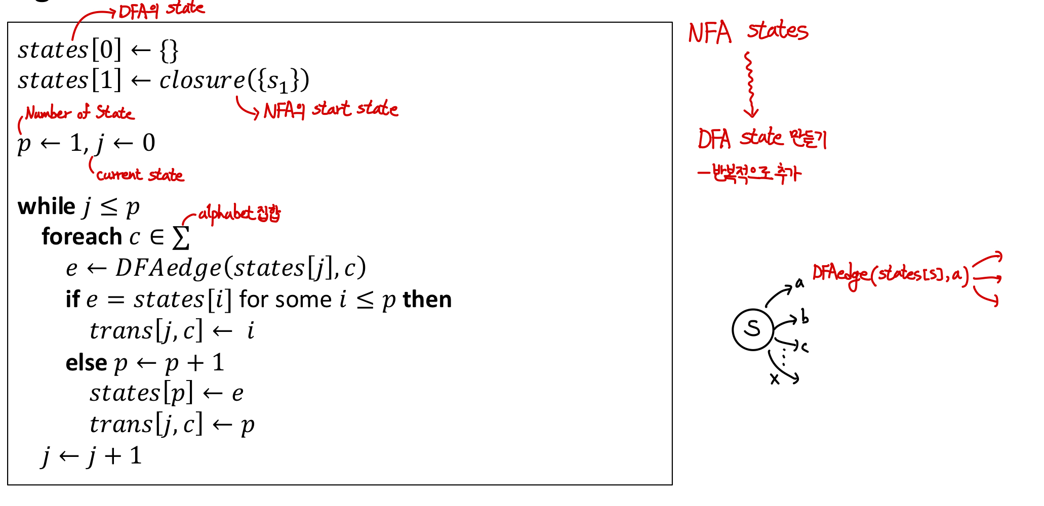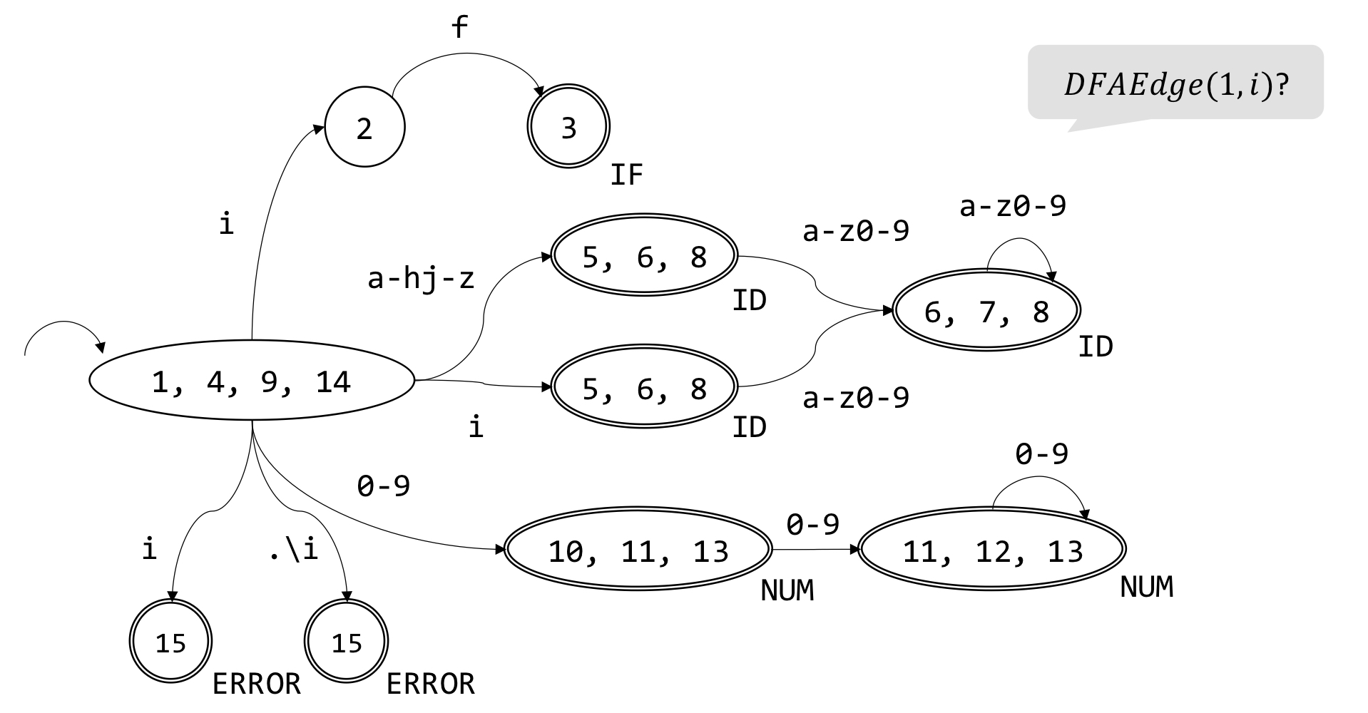 - DFAedge(d, c): d로부터 시작해서, symbol c와 ϵ만을 소모해서 도달할 수 있는 모든 NFA states의 집합(edge를 사용해서 c로 갈 수 있는 states를 구하고, closure를 통해서 그 edges로부터 갈 수 있는 모든 states의 집합을 얻을 수 있음)