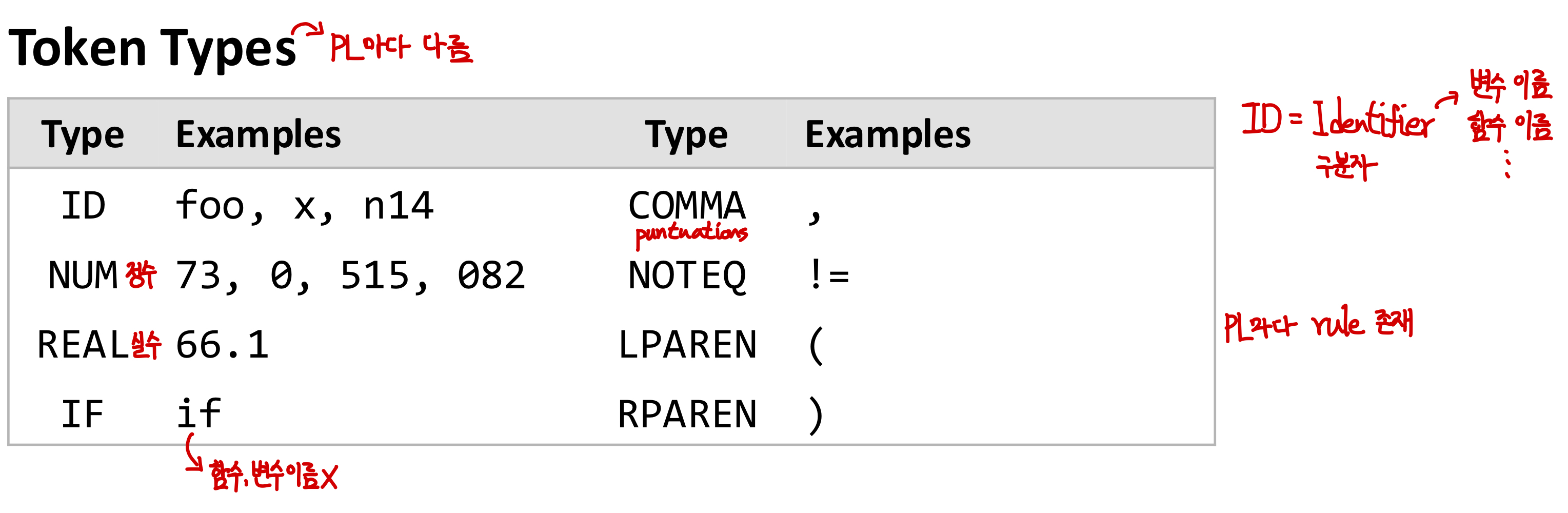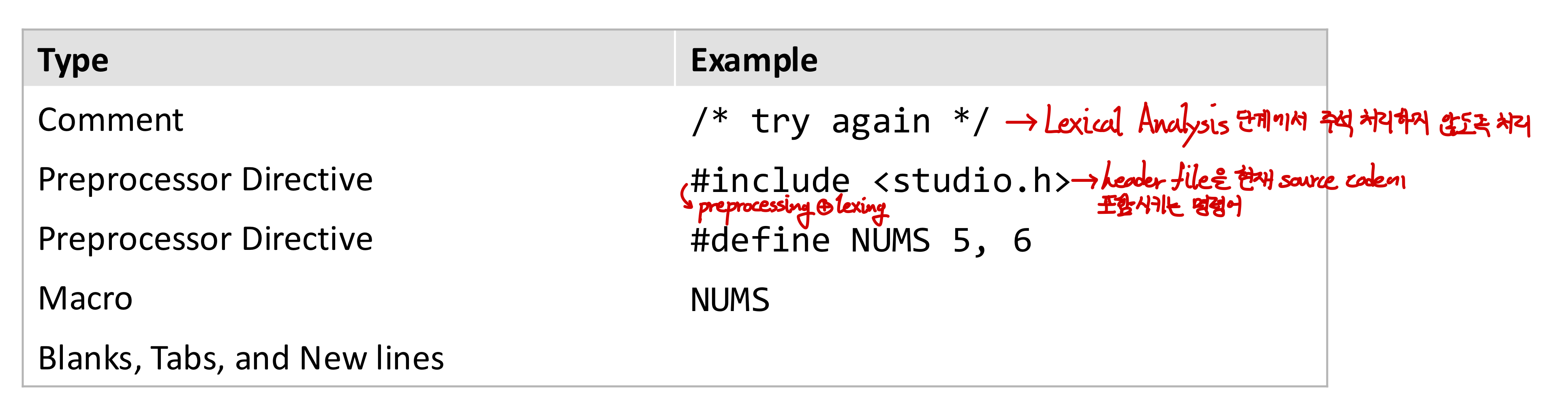 - tokens 사이에 존재하는 white space와 comments(주석) 제외