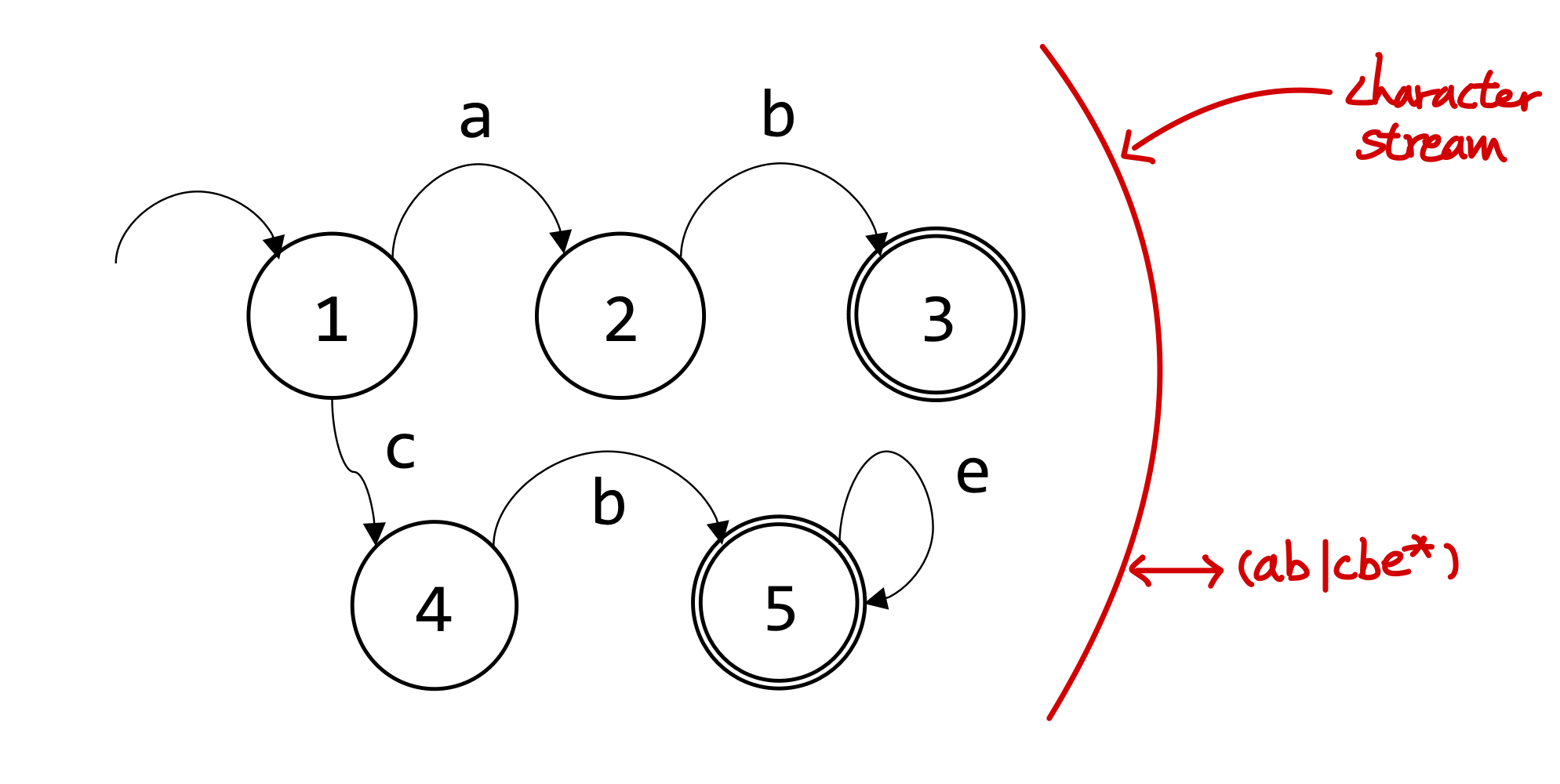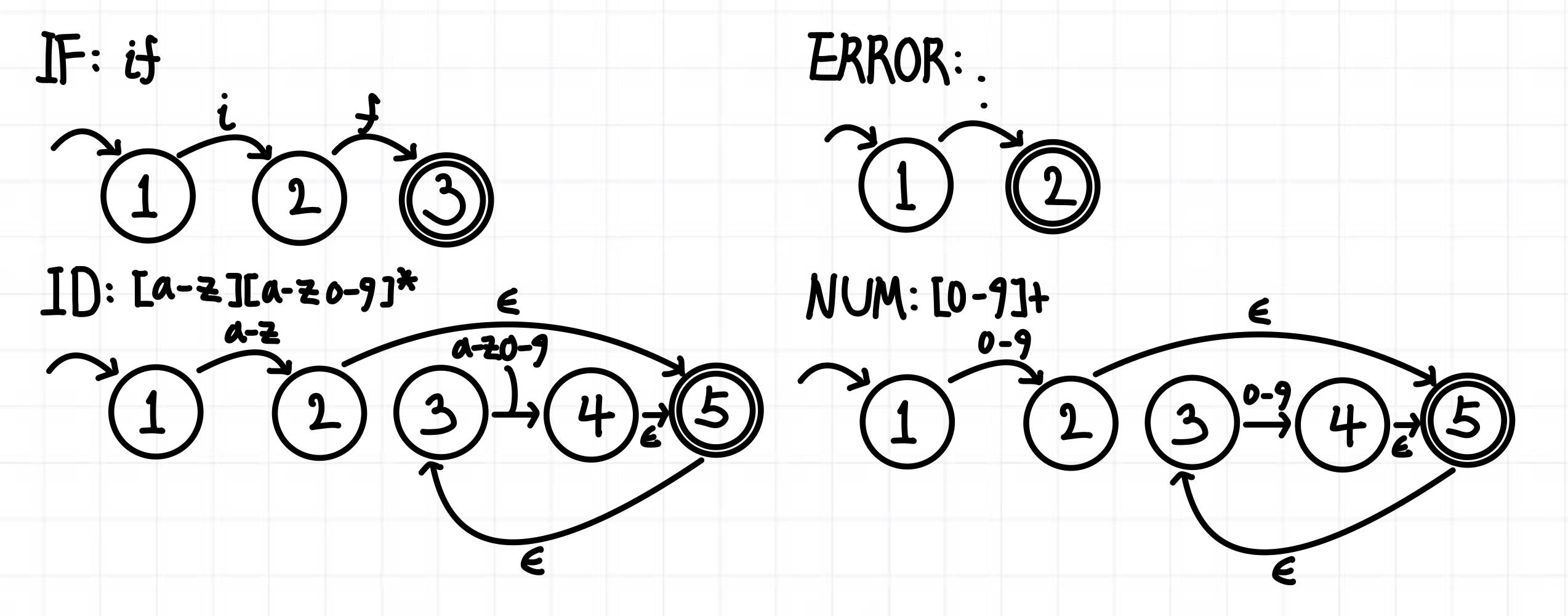 - each lexical token을 regular expressions라는 formal한 언어로 정의