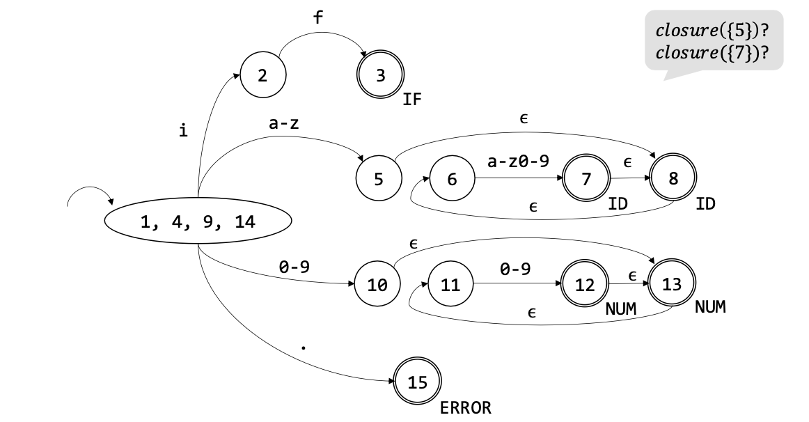 - closure(S): states의 집합 S에 속하는 모든 states로부터, 해당 inputs를 소모하지 않고 도달할 수 있는 모든 NFA의 states의 집합(= ϵ만으로 도달할 수 있는 모든 states의 집합)