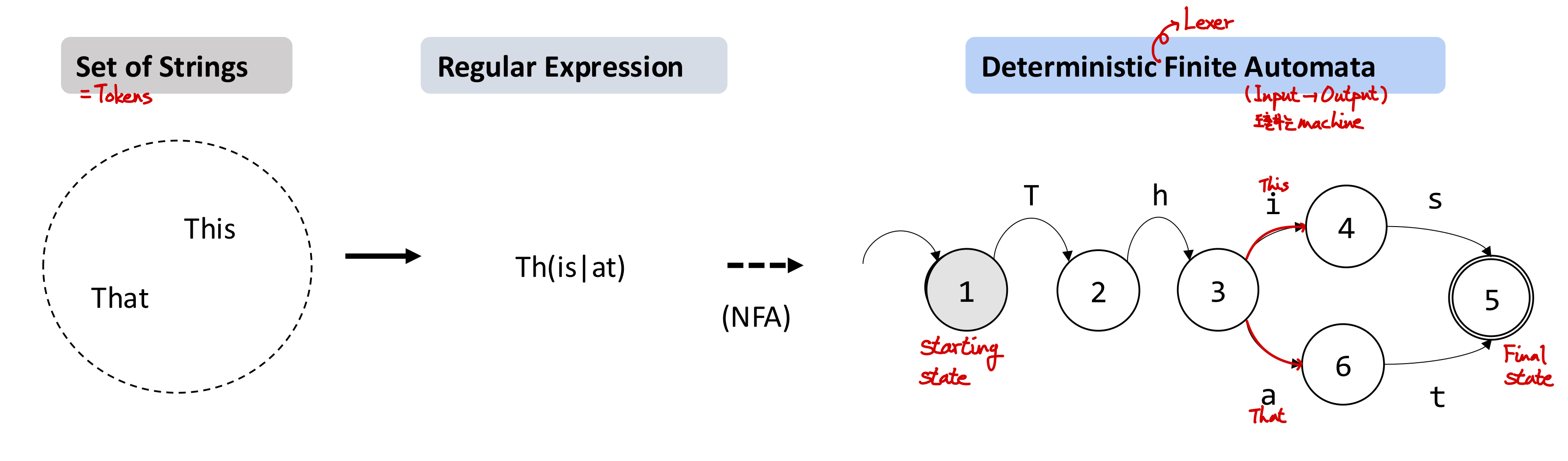 - RE에서 직접적으로 DFA로 변환하는 과정은 어려울 수 있다. -> 따라서 RE에서 NFA로의 변환 과정을 거치고, 이후 DFA로 변환하는 것이 일반적