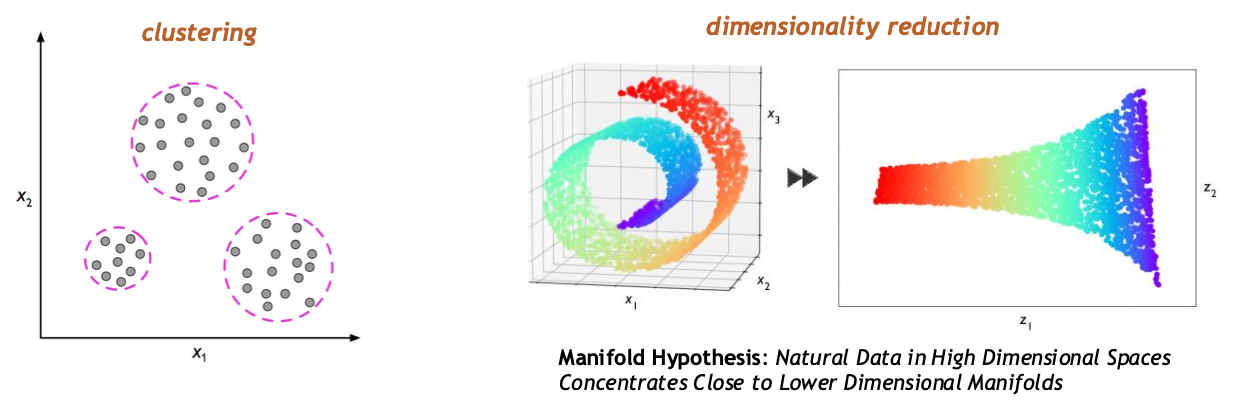 - Unsupervised Learning: 특징 벡터(input) X는 주어지는데 목푯값(output) Y가 주어지지 않는 상황