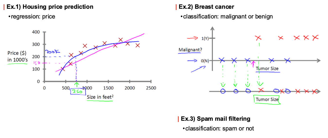 - ex) 집값 예측, 암 판별, 스팸 메일 필터링