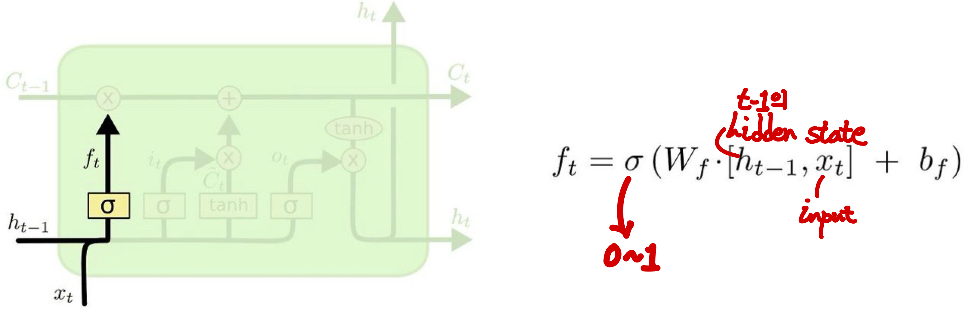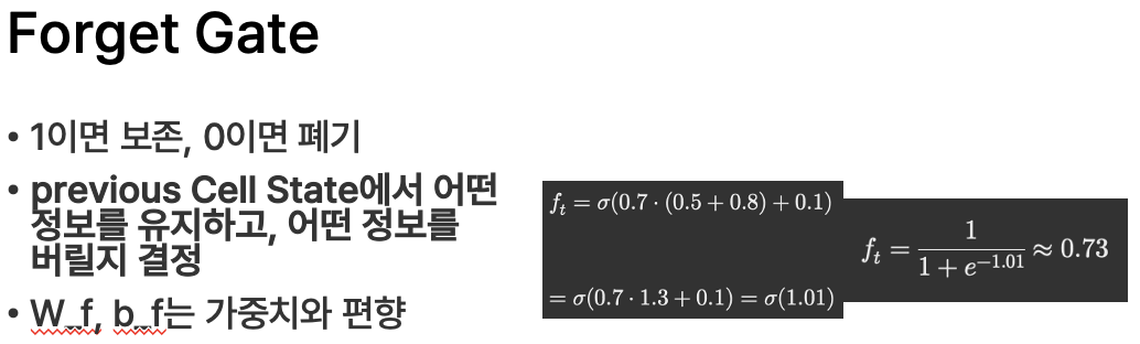 - W_f, b_f는 가중치와 편향