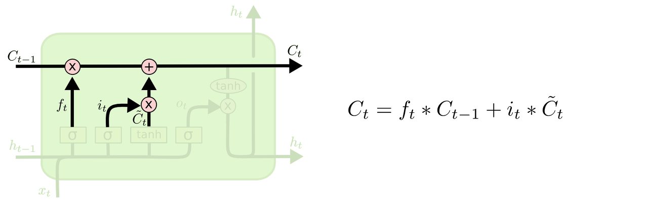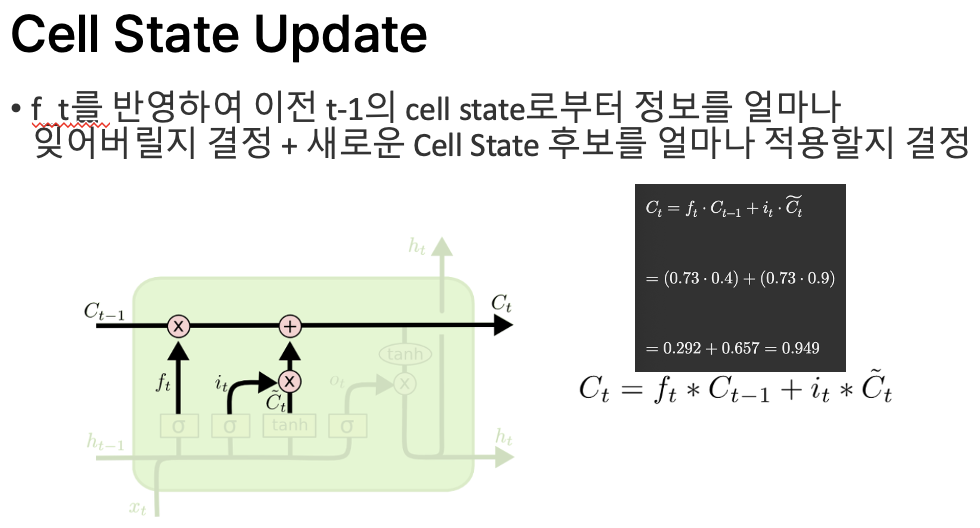 - f_t를 반영하여 이전 t-1의 cell state로부터 정보를 얼마나 잊어버릴지 결정 + 새로운 Cell State 후보를 얼마나 적용할지 결정