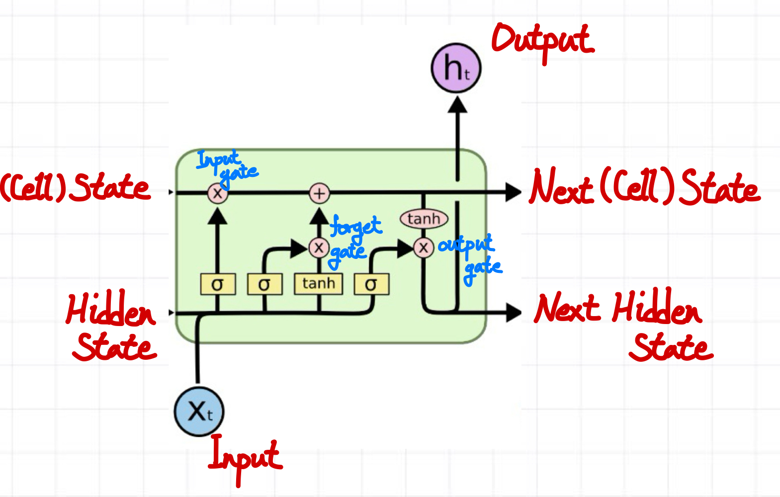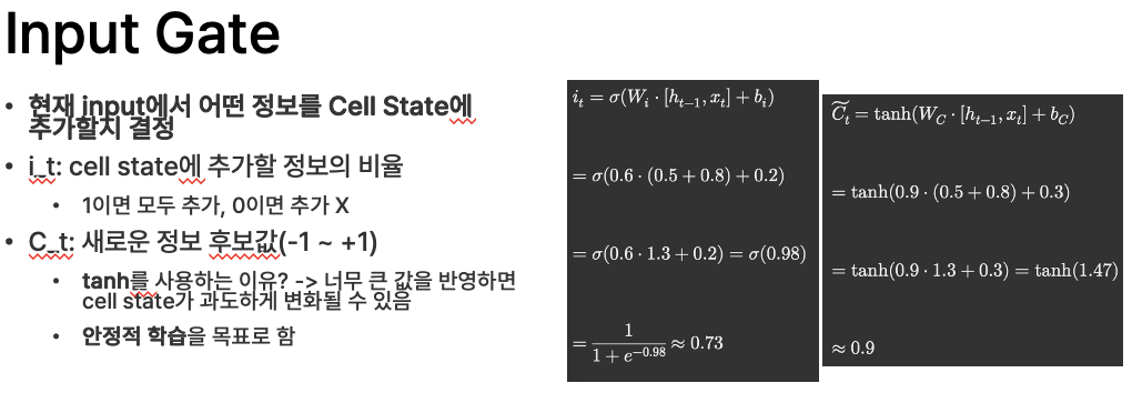 - tanh를 사용하는 이유? -> 너무 큰 값을 반영하면 cell state가 과도하게 변화될 수 있음