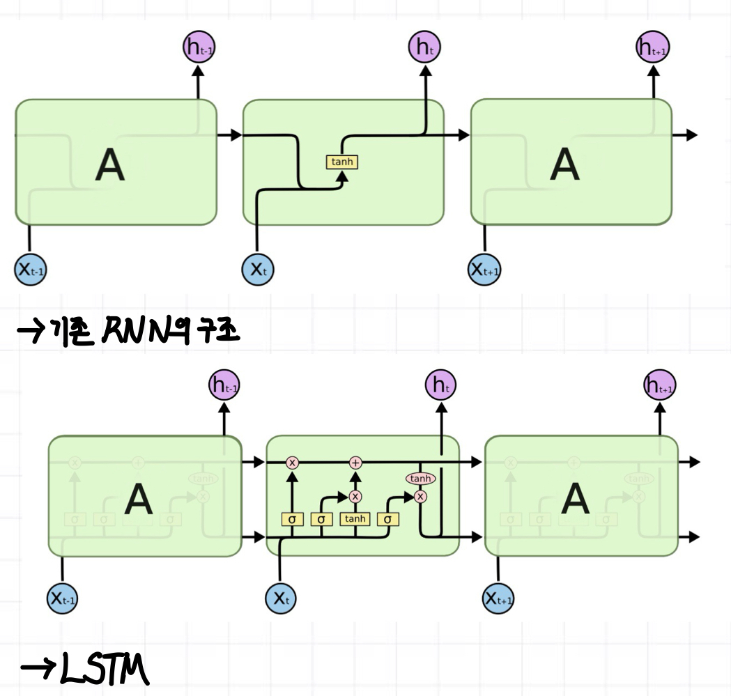 - LSTM(Long Short-Term Memory): RNN(Recurrent Neural Network)의 한 종류로, RNN의 장기 의존성 문제(long-term dependencies)를 해결하기 위해서 나온 모델