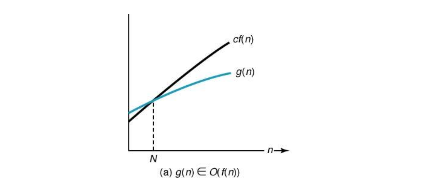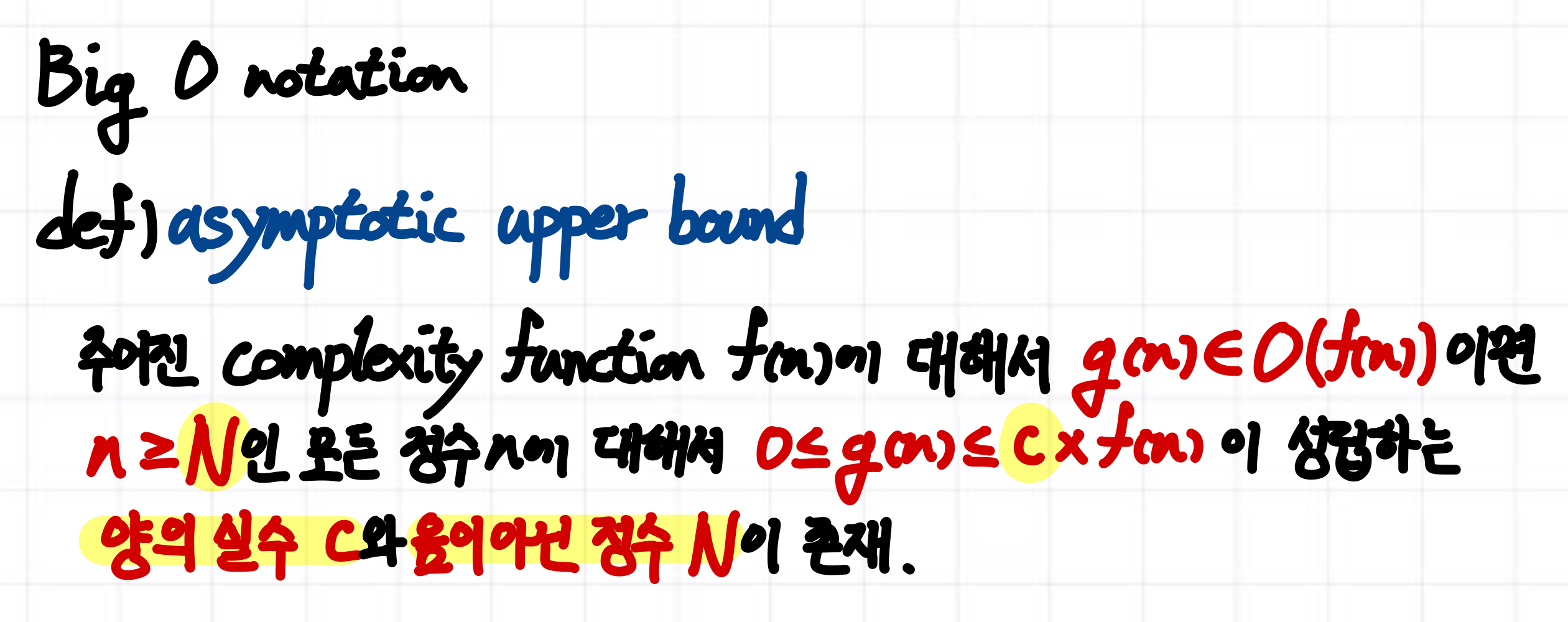 - 시간 복잡도가 O(f(n)) -> 입력 크기 n에 대해서 알고리즘의 수행 시간이 아무리 늦어도 cf(n)은 된다는 의미