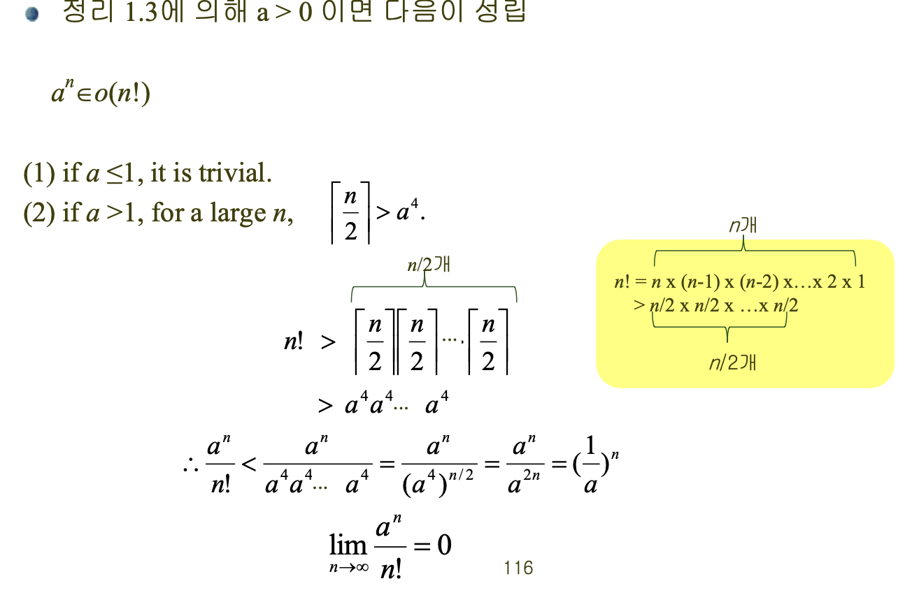 -> n이 충분히 커지면, n/2의 천장함수가 a^4보다 커짐