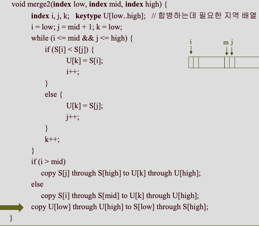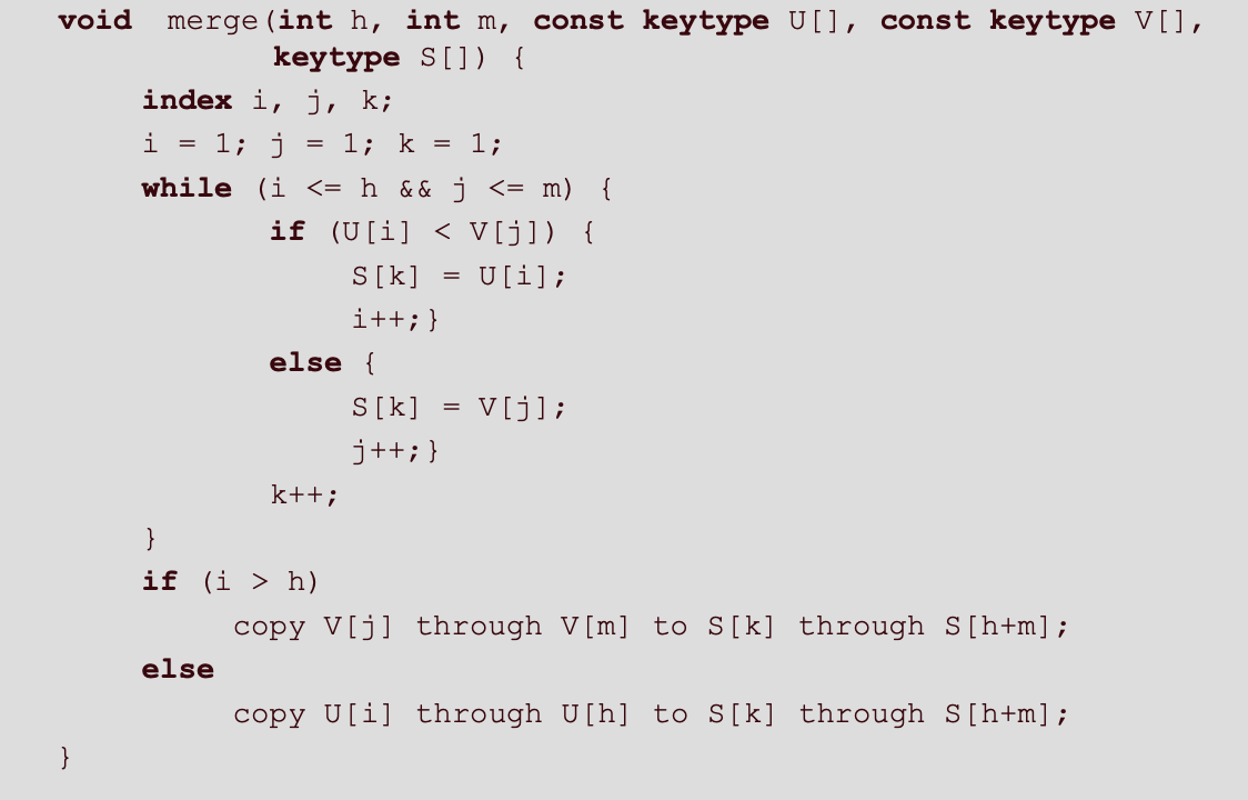- 출력: U와 V에 있는 키들을 하나의 배열에 정렬한 S[1..h+m]
