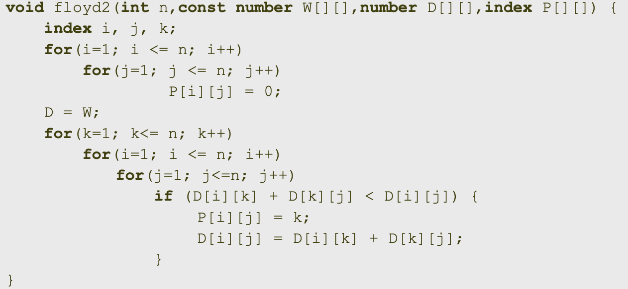 - 출력: 최단경로의 길이가 포함된 배열 D, 다음을 만족하는 배열 P