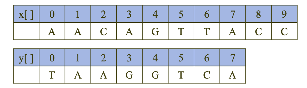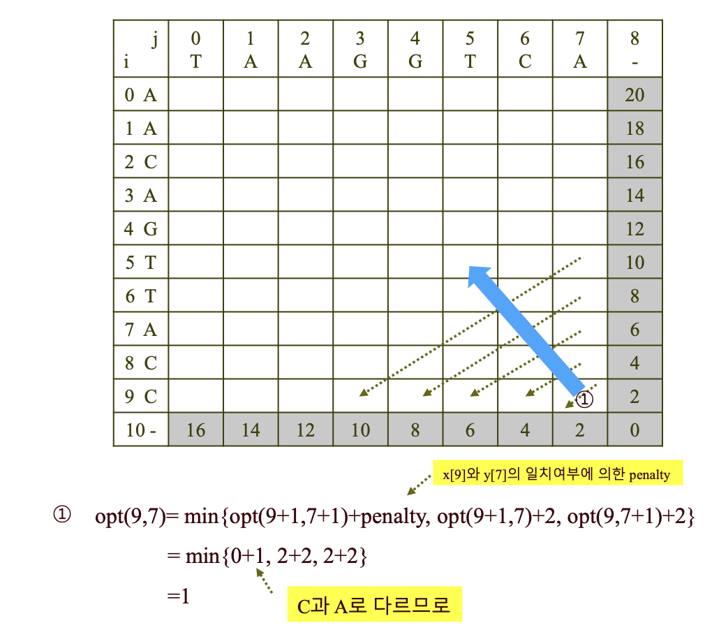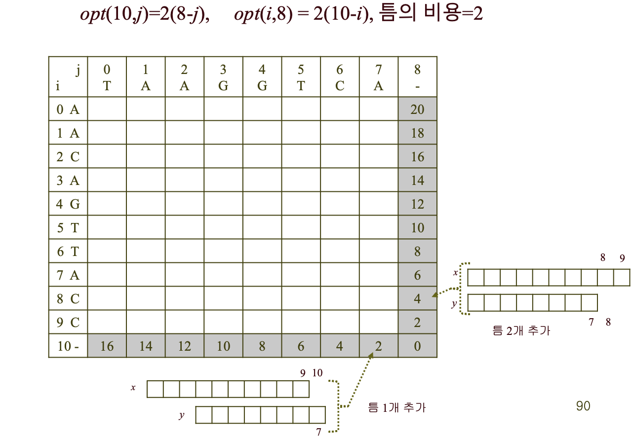 - opt(0, 0): 부분 서열 x[0, ..., 9]와 y[0, ..., 7]의 최적 맞춤 비용 -> 구하려는 최종 비용