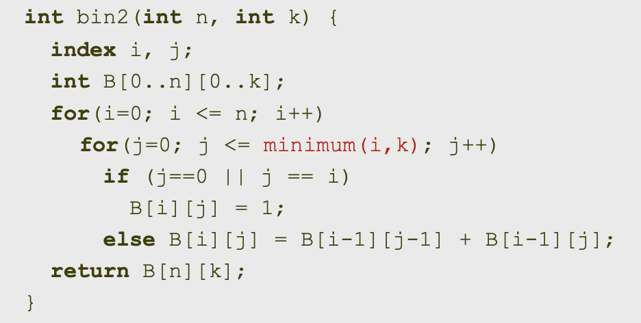 - nCk를 구하기 위해서 B[0][0]부터 시작하여 위에서 아래로 재귀 관계식을 적용하여 배열을 채워 나가면 됨