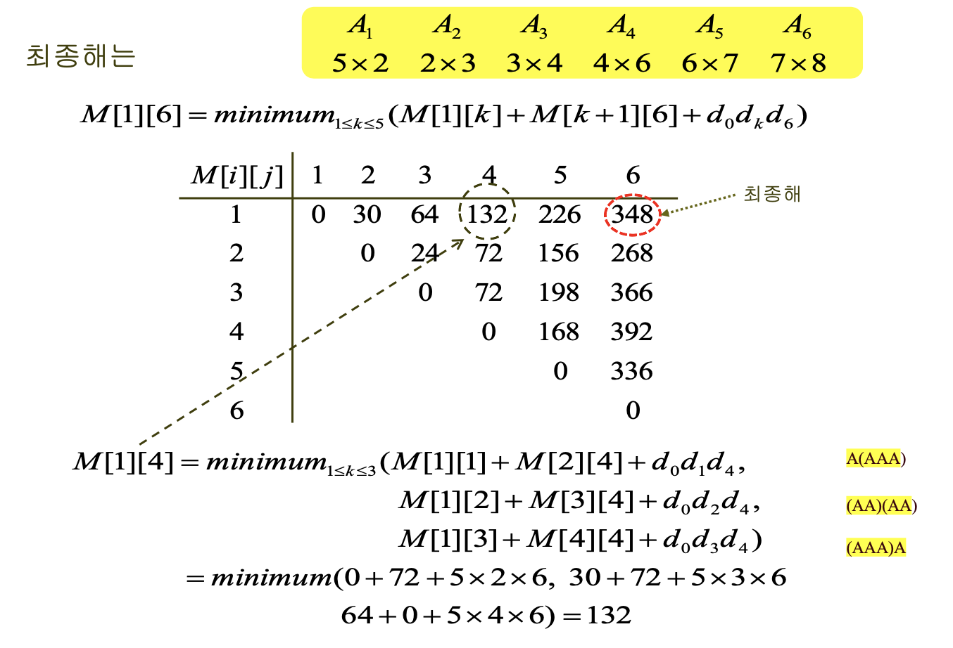 - 연쇄적으로 행렬곱셈을 수행할 때, 어떤 행렬곱셈을 먼저 수행하느냐에 따라 필요한 총 곱셈의 횟수가 달라짐