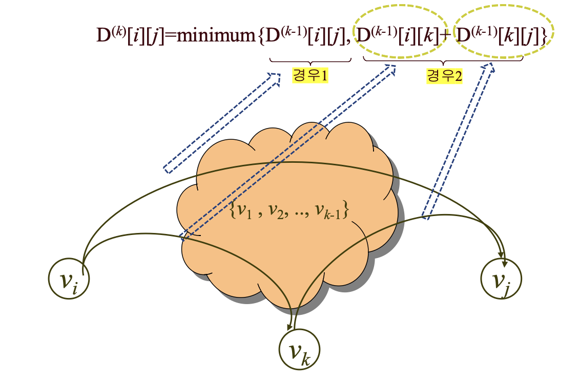 - vi에서 vj까지 가는 최단경로의 중간에 놓여 있는 정점이 최소한 하나는 있는 경우 -> 놓여 있는 정점 중에서 가장 큰 인덱스