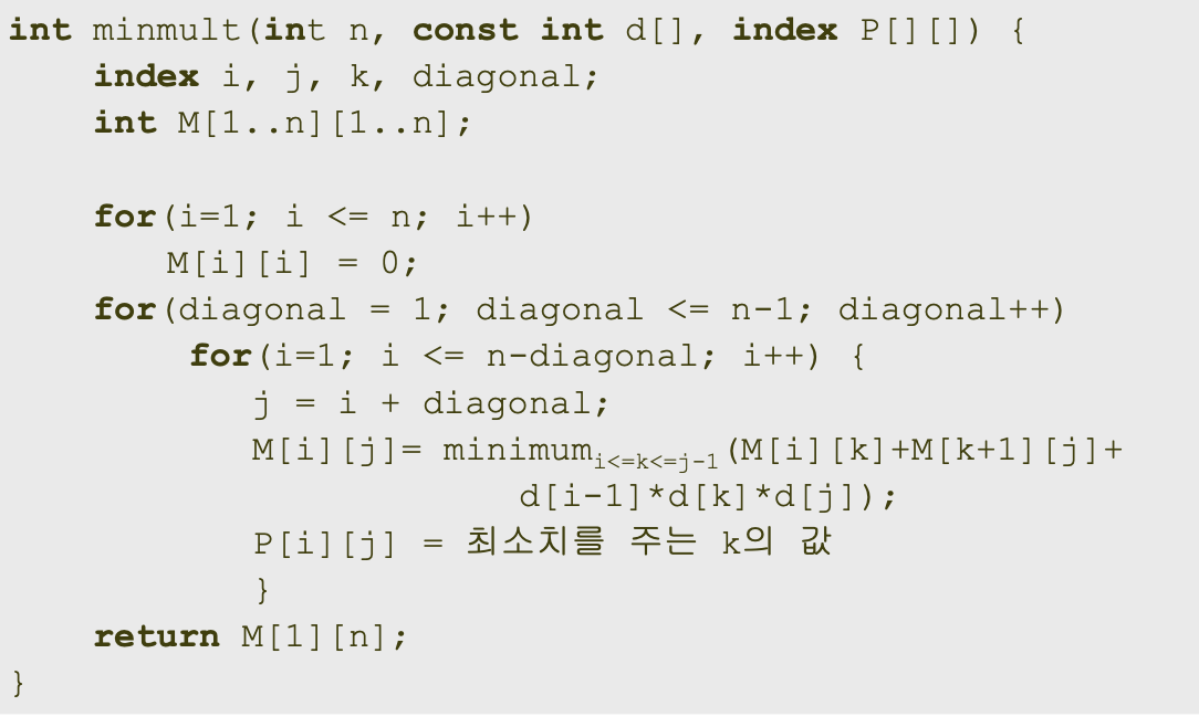 - 연쇄적으로 행렬곱셈을 수행할 때, 어떤 행렬곱셈을 먼저 수행하느냐에 따라 필요한 총 곱셈의 횟수가 달라짐