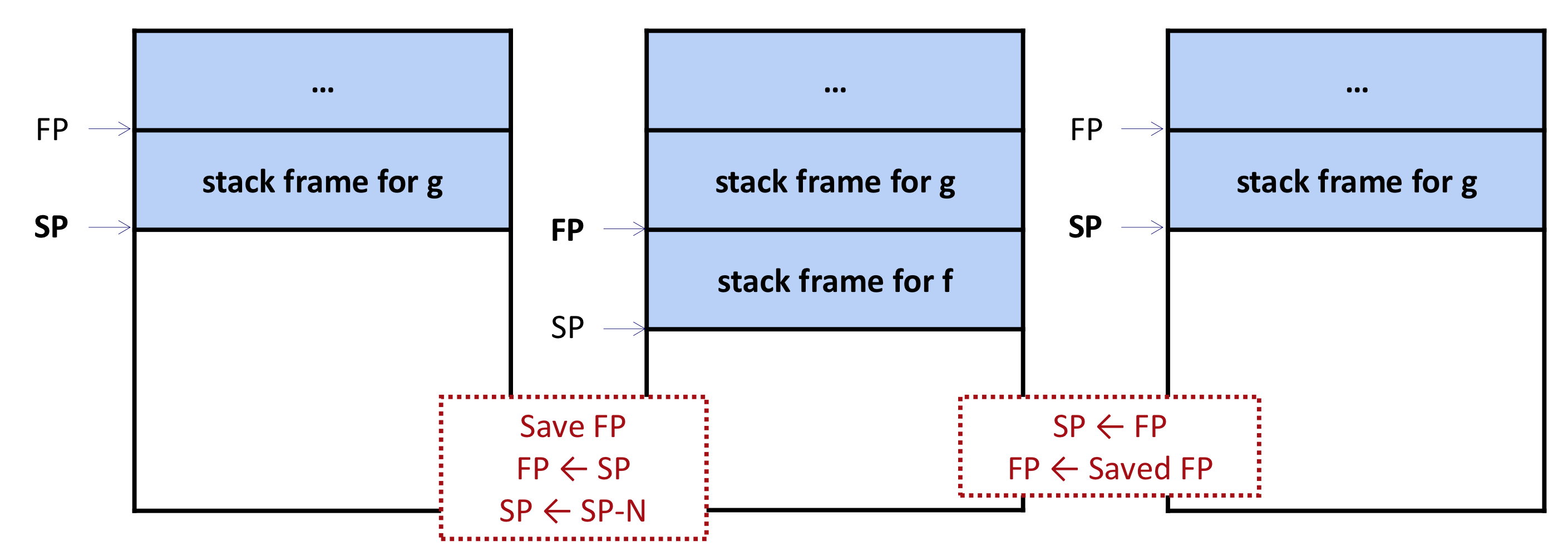 - SP는 새로운 stack frame의 크기(N)만큼 아래로