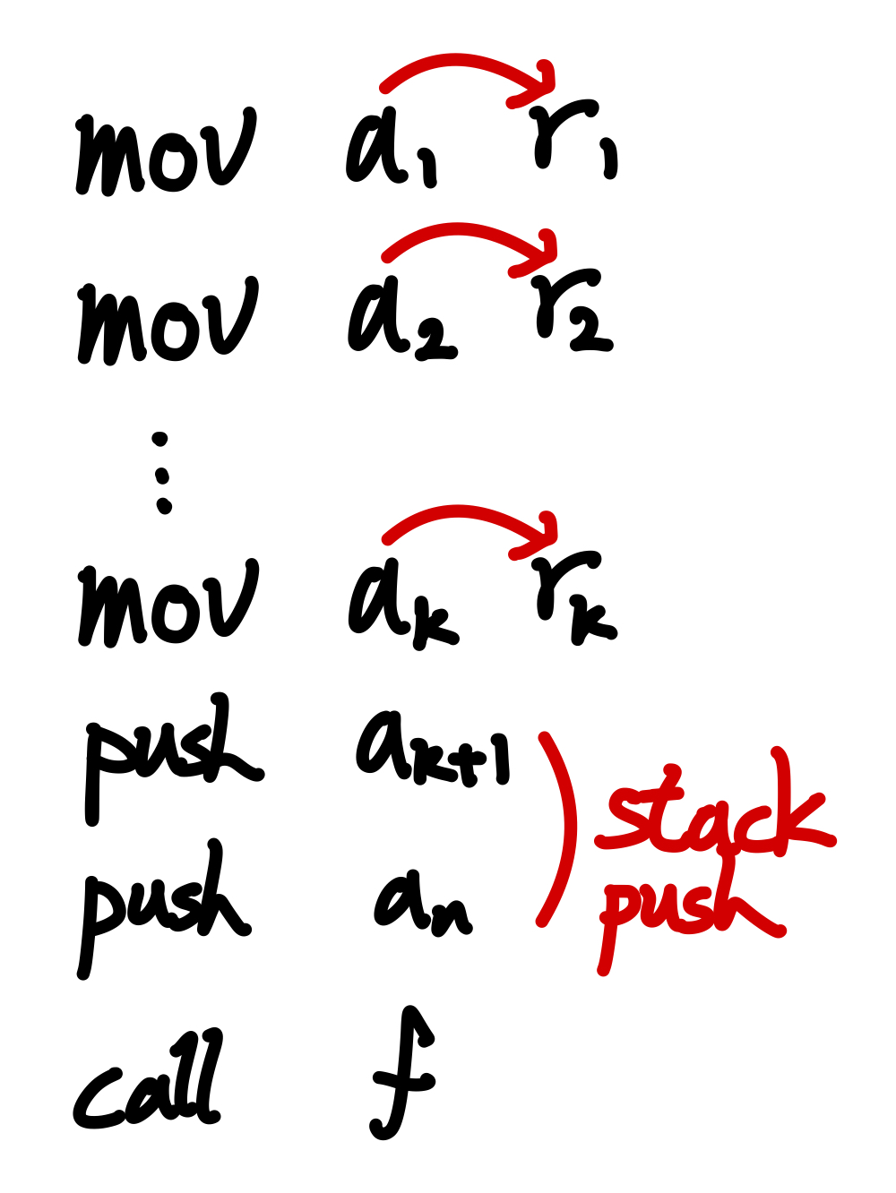 - a1, ..., ak를 registers r1, ..., rk에 저장