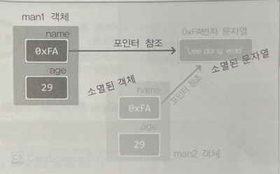 디폴트 복사 생성자는 단순히 멤버 대 멤버 복사만 진행하기 때문에, 두 생성자의 멤버들이 같은 메모리 공간을 참조하게 된다. 그렇기 때문에 소멸자가 한 번만 실행 되면 두 멤버에게 할당된 공용 메모리 공간이 소멸되기 때문에 다음 소멸자가 호출되면 소멸시킬 메모리 공간이 없는 상태가 되는 것이다. 이미 지워져버린 공간을 대상으로 delete 연산을 진행하는 것은 문제가 된다. 그렇기 때문에 복사 생성자를 사용할 때에는 이런 문제를 신경써야 한다.