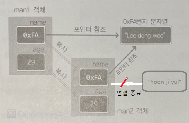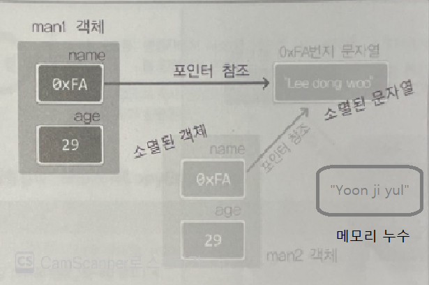- 문자열 "Yoon ji yul"을 가리키던 문자열의 주소 값을 잃게 된다. -> 해당 문자열은 소멸이 불가능한 상태가 되어 메모리 누수로 이어진다.