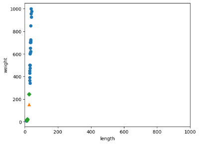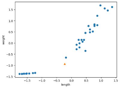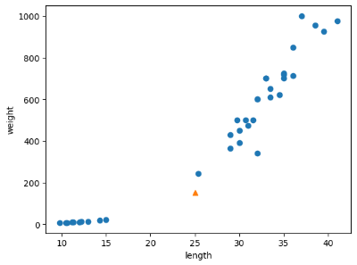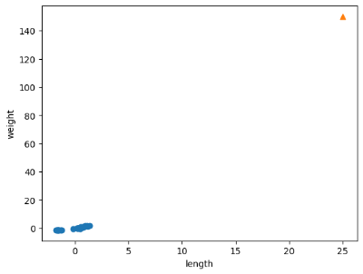 -> 새로 주어진 샘플인 [25, 150]을 동일한 비율로 변환하지 않으면 그림과 같이 출력된다.