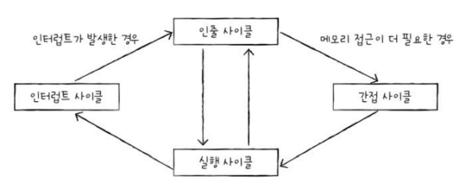 - 간접 사이클(indirect cycle): 명령어의 주소를 CPU로 가져왔을 때, 해당 명령어 주소에 저장된 명령어를 인출하기 위해 메모리에 다시 접근하는 단계