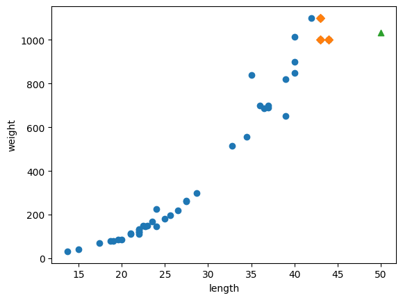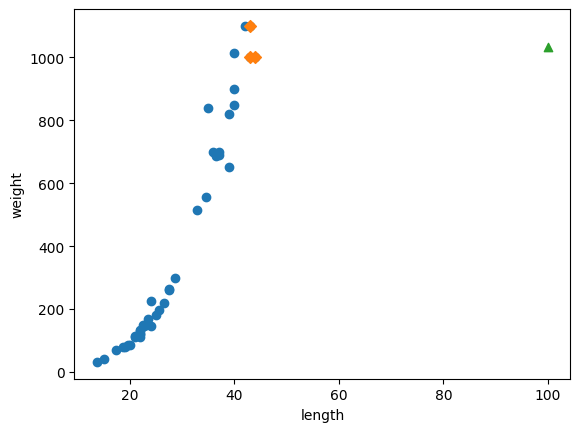 -> k-최근접 이웃 알고리즘은 해당 샘플의 무게를 1033g 정도로 예측했다.