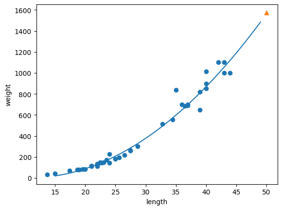 위를 통해 모델이 학습한 그래프를 $무게 = 1.01*길이^2 -21.6*길이 + 116.05$로 예측할 수 있다.