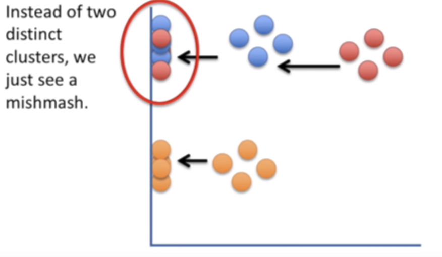 선형 방식으로 정사영하여 차원 축소를 진행하기 때문에 클러스터링이 무너지기 쉽다.