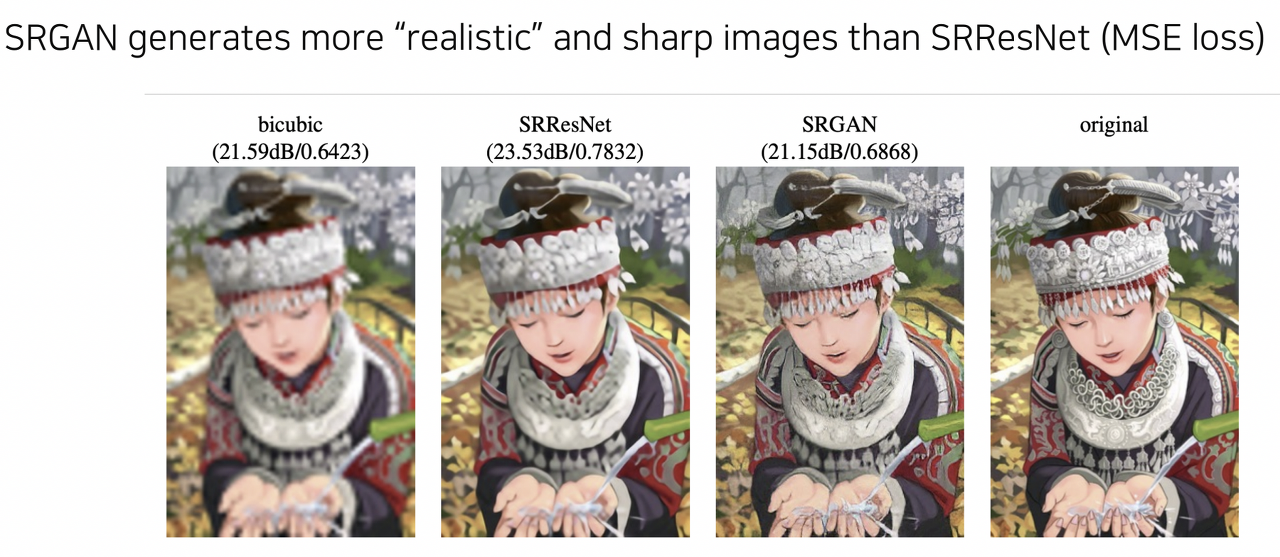 - Super Resolution GAN: input은 저해상도 image, output은 고해상도 image, real data로 고해상도 image