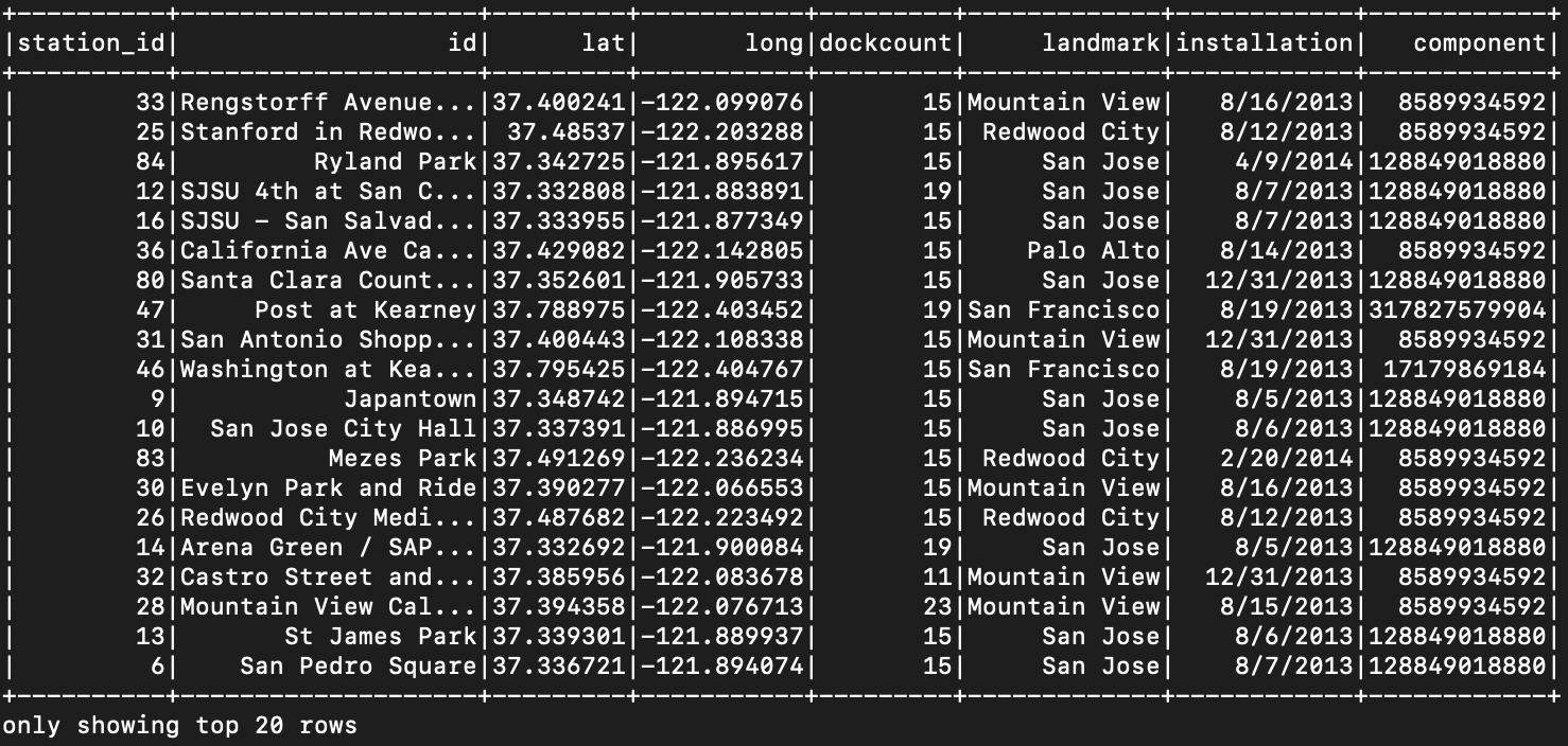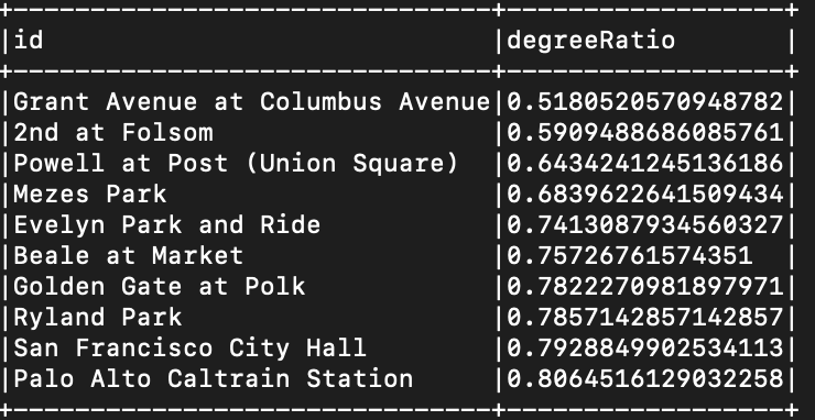 >>> minGraph = GraphFrame(stationVertices, tripEdges.sample(False, 0.1))
