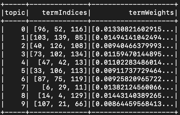 - tol: 중심값의 변화가 모델이 충분히 최적화되었다는 것을 알려주는 임곗값을 지정하여 maxIter 값만큼 반복 수행을 하기 전에 조기 중지시킬 수 있다.