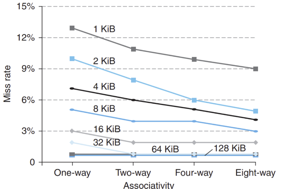 - Associativity 증가 -> 전에 쓰인 block이 교체될 확률 감소 -> miss rate 감소