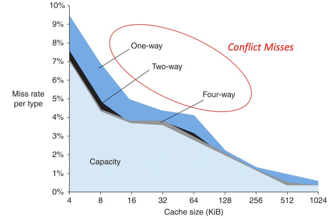 - Conflict misses -> associativity가 많아질수록 miss rate 감소