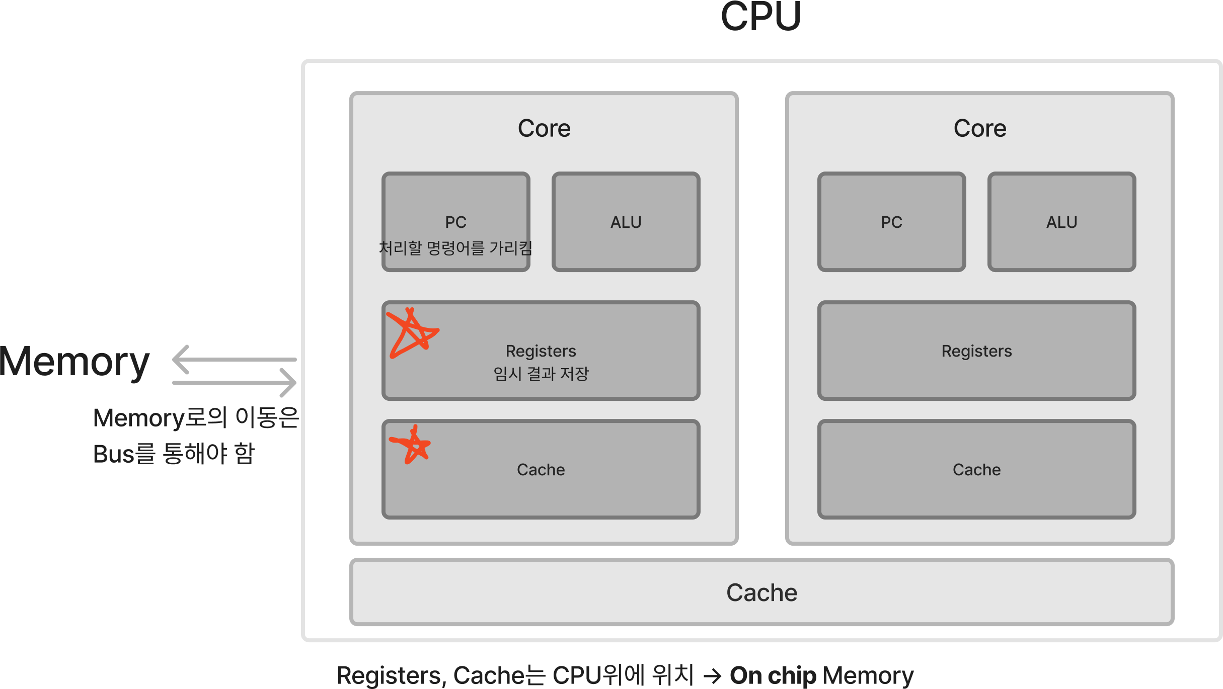 - registers & cache는 CPU 상에 존재 -> on-chip