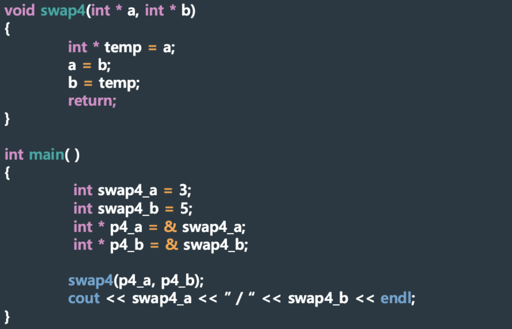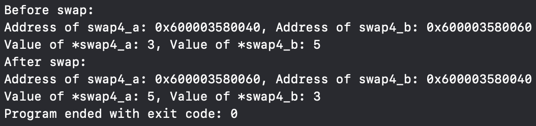 cout << "Value of *swap4_a: " << *swap4_a << ", Value of *swap4_b: " << *swap4_b << endl;