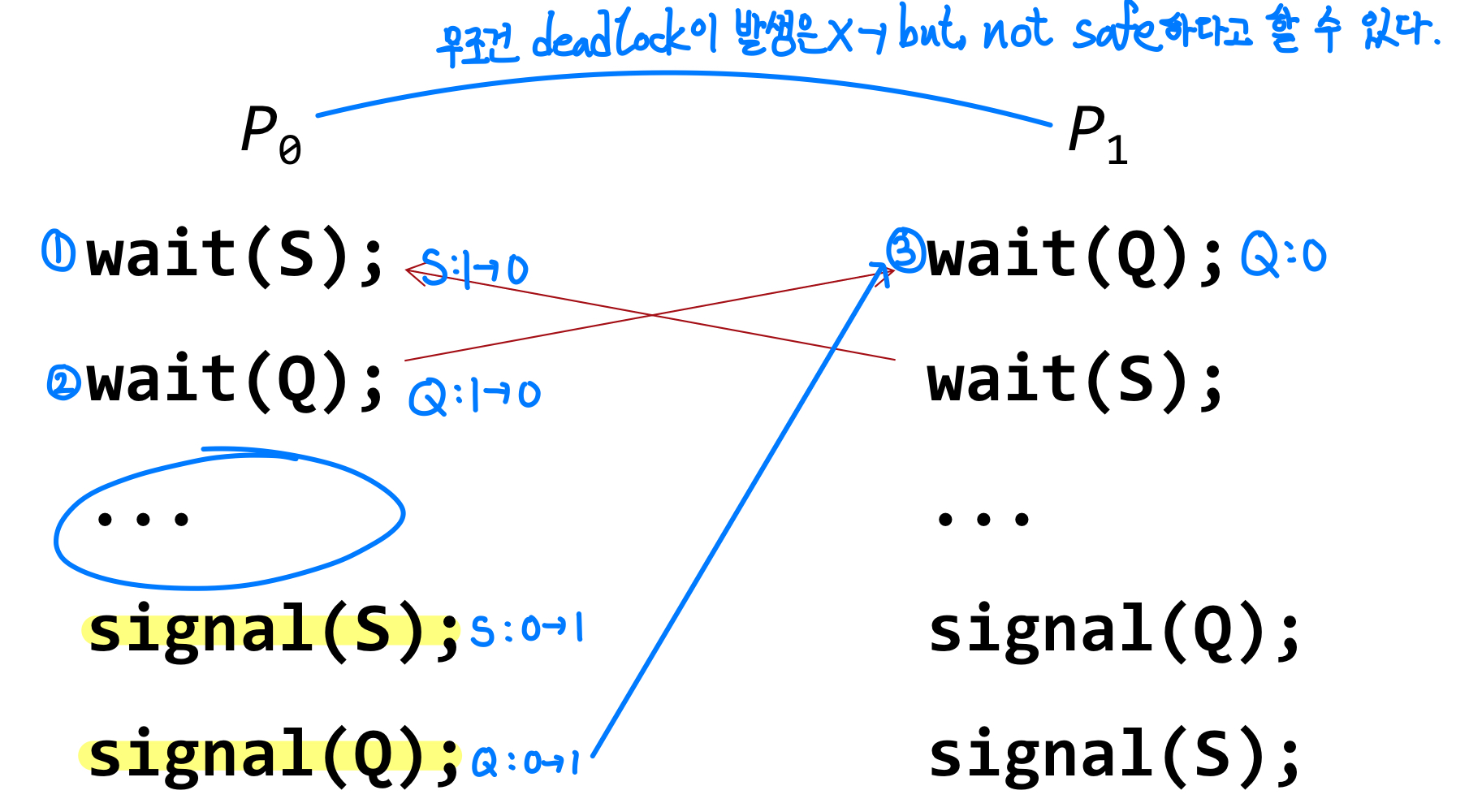 - 4가지 조건을 동시에 만족하는 경우에 deadlock 발생
