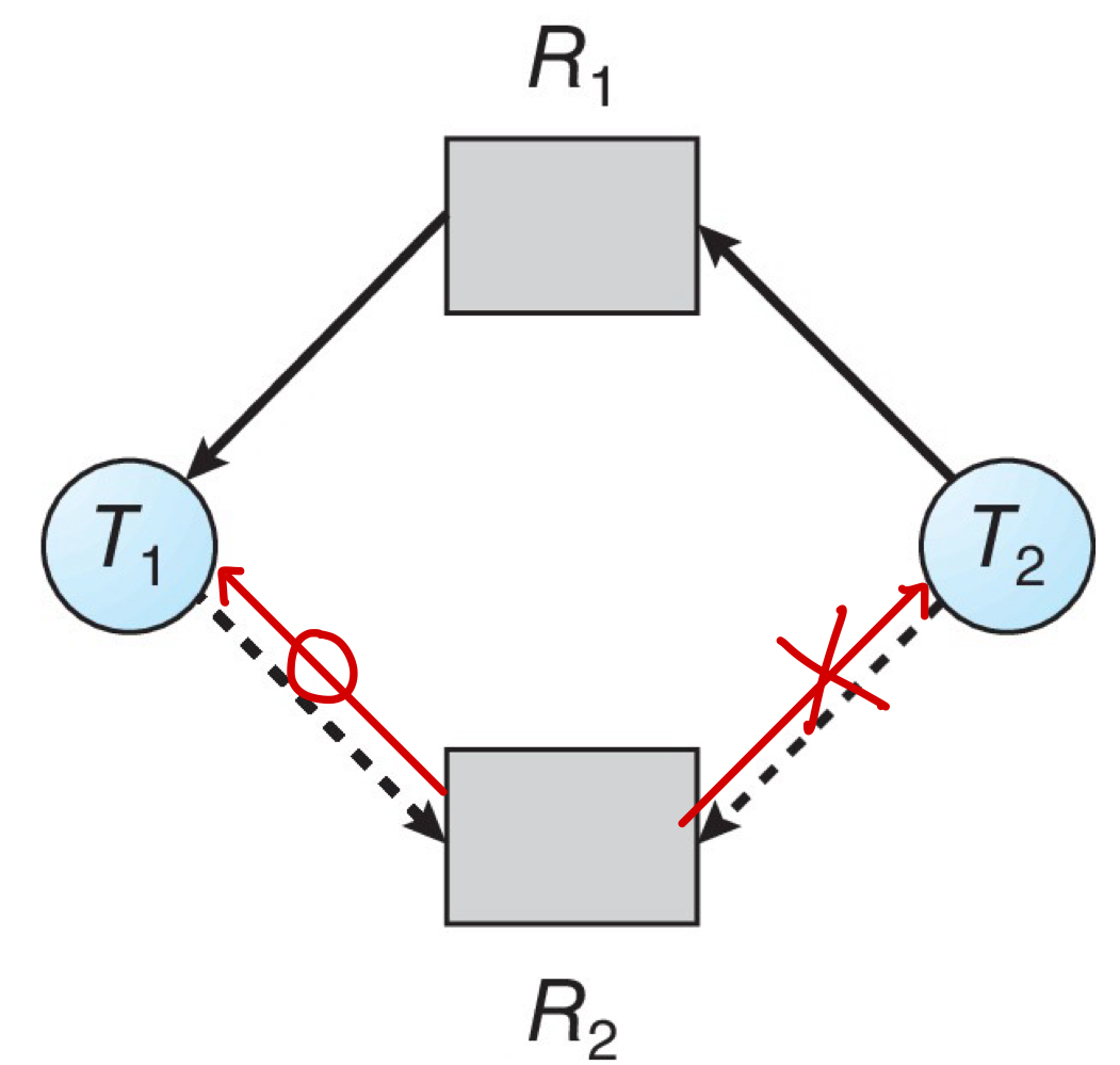 - Resources 차례대로 요구: R_j는 F(R_j) > F(R_i)일 때 요청받을 수 있음