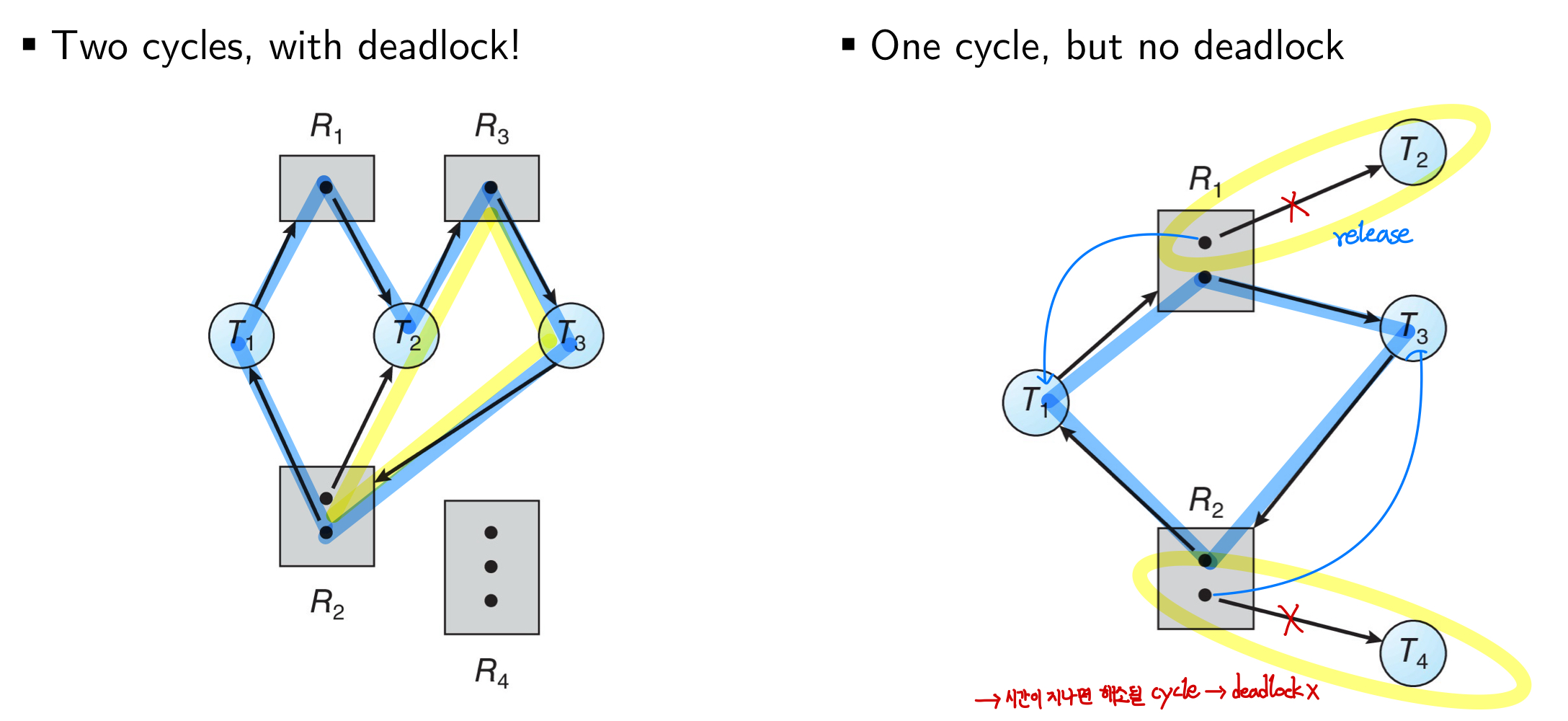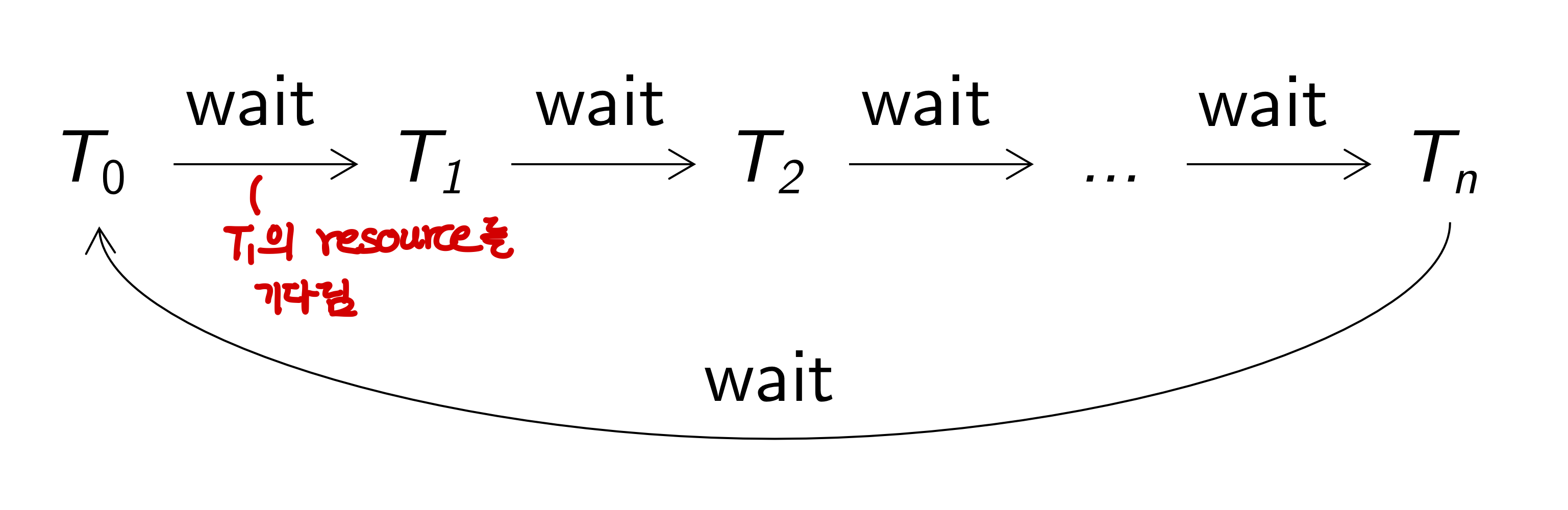 Ti가 resource Ri를 waiting & Ri는 T_(i+1)에 의해 소유된 상태
