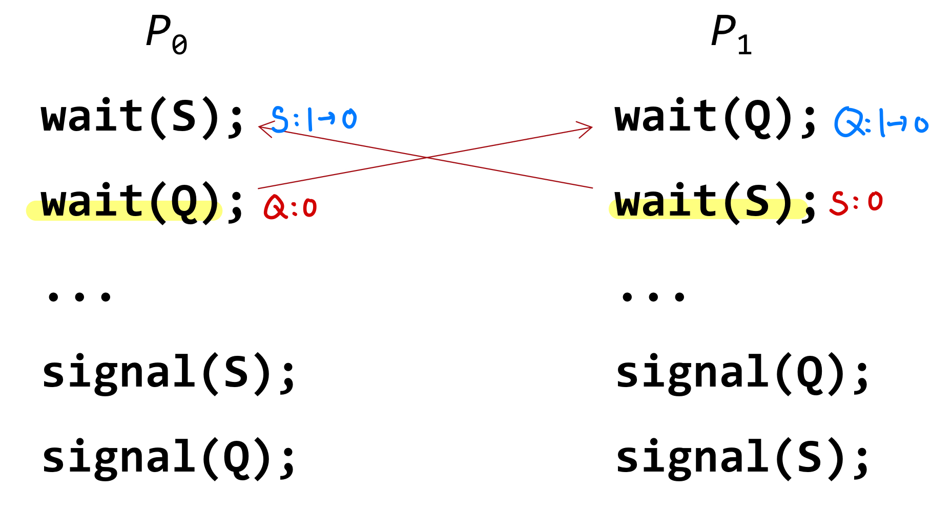 - S & Q -> 1로 초기화된 semaphores