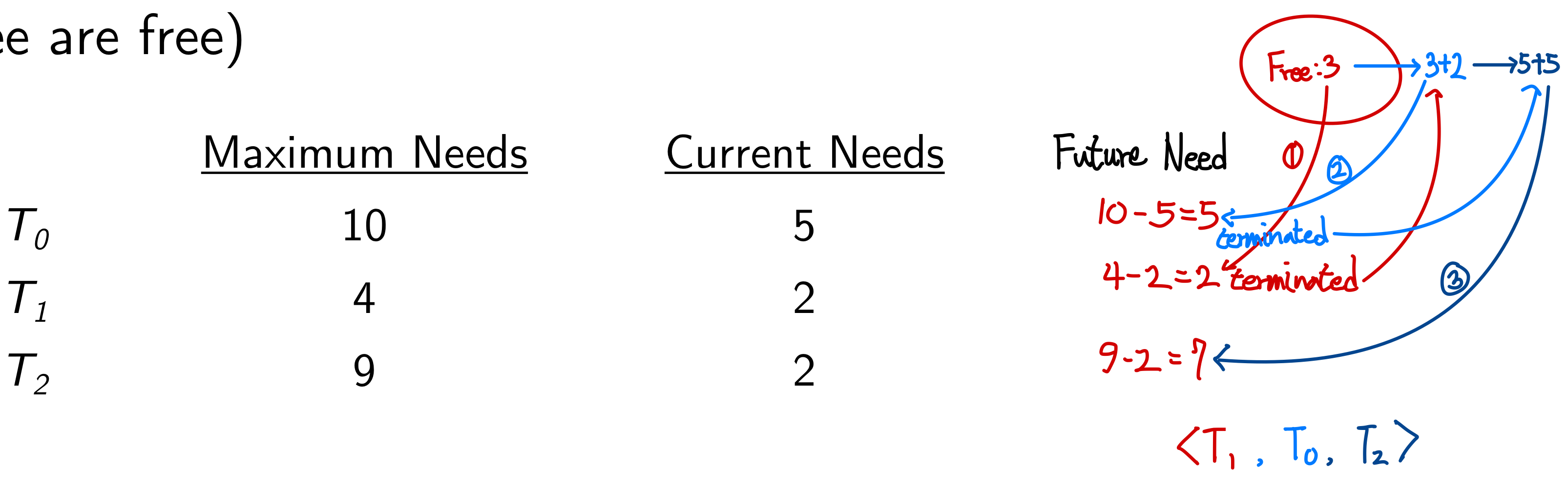 - <T1, T2, ..., Tn>: Ti가 사용할 수 있는 resources -> currently available resources + Tj에 할당된 resources(j < i)