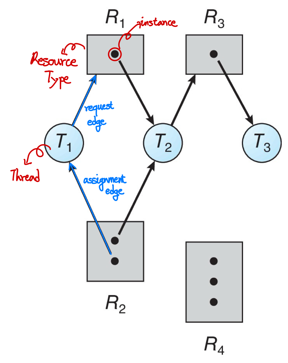 - T2 holds one instace of R1, one instance of R2, and is waiting for an instance of R3