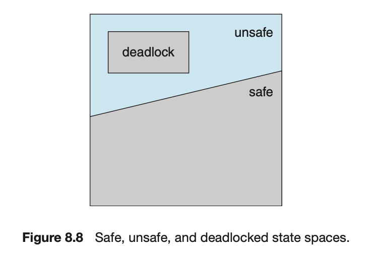 - thread가 available resource를 요청할 때, 시스템은 즉각적 할당이 시스템을 safe state에 남겨두는지 판단해야 함