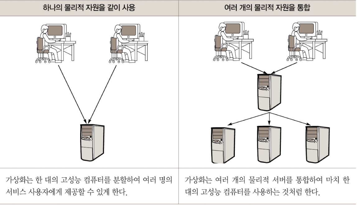 - Virtualization: 여러 개의 물리적 자원을 하나로 통합해서 관리하거나, 여러 개로 분할하여 사용하는 기술