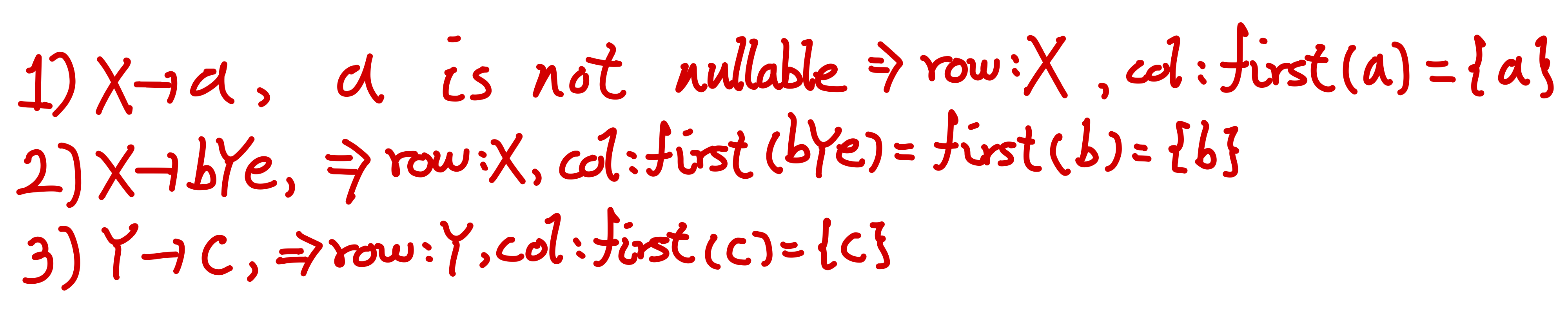 - if 𝛾 is not nullable -> row: S, col: FIRST(𝛾)에 포함되는 모든 요소